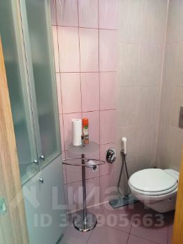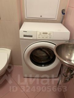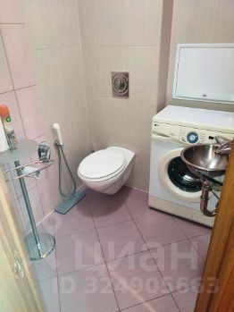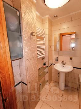 В малом санузле унитаз с гигиеническим душем, раковина - современная сантехника радует глаз. Новая стиральная машина, вместительный шкаф для хозяйственных принадлежностей.
