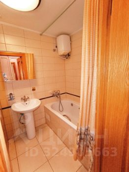 В большом санузле царство чистоты и функциональности: ванна 180 см, раковина, водонагреватель, навесная полка.