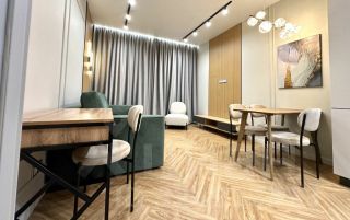 В квартире сделан дизайнерский ремонт, предусмотрена вся необходимая мебель как на кухне, так и в комнатах. Оснащена современной техникой: кондиционер, холодильник, посудомоечная и стиральная машины, телевизор. Санузел совмещенный с ванной, а из окон открывается вид на улицу. Также есть лоджия, где можно приятно провести время на свежем воздухе.