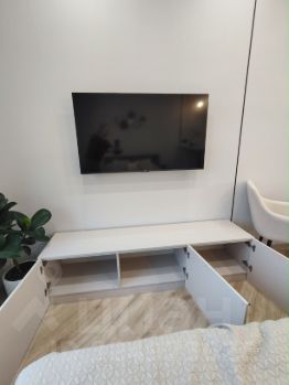 Бытовая техника: кондиционер , встроенный холодильник,стирально-сушильная машина,плита электрическая,вытяжка, встроенная микроволновая печь,телевизор на 43 дюйма,Так же в студии есть посуда(тарелки ,чашки, сковородка ,кастрюля),столовые приборы,постельные принадлежности,гладильная доска,утюг.