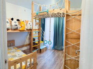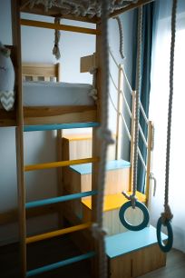 В детской мебель из массива березы, две кровати, шкаф, канат, кольца, шведская стенка, лазалки.