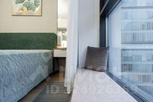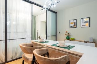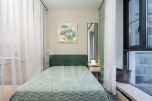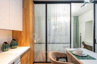 Предлагается к аренде стильная студия премиум-класса с дизайнерским ремонтом, выполненная в светлых, гармоничных тонах с акцентами зеленого. Пространство в студии разграничено уютной раздвижной перегородкой, которая отделяет зону спальни, рабочую зону и кухню, создавая ощущение двух комнат в компактном формате, где удобно и отдыхать, и работать.