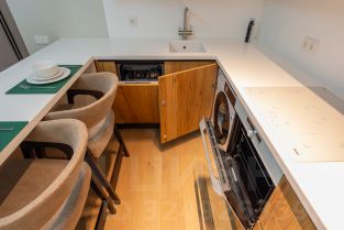 Подоконник с мягкими подушками представляет собой идеальное место для утреннего кофе или чтения, а просторная кухня премиум-уровня и барный стол позволяют экспериментировать с блюдами и проводить вечера после работы в комфортной атмосфере. Все детали продуманы, чтобы создать уют, комфорт и функциональность в каждой зоне квартиры.