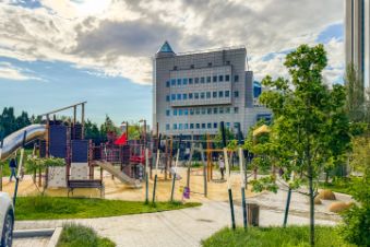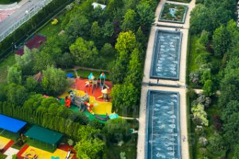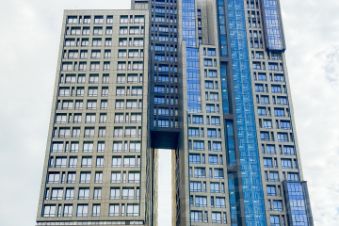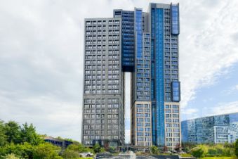 В доме имеются панорамные лифты на фасаде, откуда открывается вид на город уже по пути домой. В лобби отделка использует натуральный камень, панели из оникса, стойка ресепшн и мягкие зоны для ожидания. Внутренняя территория дома (двор) имеет свой собственный сад с дорожками, фонтанами, детскими и спортивными площадками. Для жителей работают фитнес-студия и большая детская игровая, на первом уровне — повседневные сервисы.