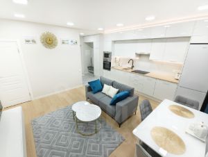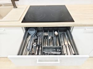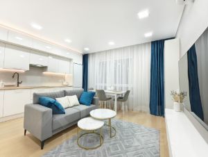 Вся бытовая техника в наличии: 3 кондиционера (в каждой комнате), 2 телевизора, посудомоечная и стиральная машины, варочная панель, вытяжка, духовой шкаф, микроволновая печь, холодильник, электрочайник, тостер, миксер, утюг, беспроводной пылесос, проточный водонагреватель (на период летних отключений). Установлен WiFi роутер, проведён интернет (включен в стоимость аренды). Кухня полностью укомплектована всей необходимой посудой, кастрюлями, сковородами, столовыми приборами и прочими кухонными принадлежностями. Квартира оснащена датчиками протечки воды, и детектором дыма, а также защитой по линии электроснабжения - УЗО, дифавтоматы.