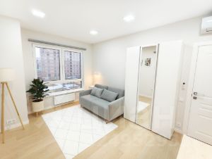 Квартира полностью меблирована и уже укомплектована всем необходимым для комфортного проживания. В спальне установлена двуспальная кровать с матрасом, новые подушки, одеяла, и постельное белье уже есть в квартире. Шкафы в каждой комнате обеспечивают много места для хранения. В кабинете/детской есть раскладной диван, письменный стол, кресло, тумбы. В зоне гостиной - раскладной обеденный стол. На всех окнах установлены съемные москитные сетки. Есть шторы, включая плотные.