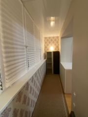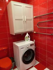 Санузел совмещенный, оформлен в ярких красных тонах, оснащен стиральной машиной. Лоджия застеклена, что позволяет использовать ее круглый год.