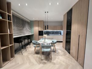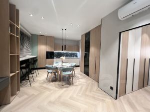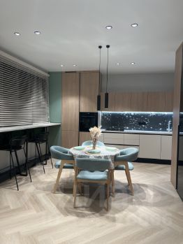 Техника: стиральная и сушильная машина, посудомоечная машина, кухонная мойка с измельчителем отходов, встроенный холодильник, индукционная варочная поверхность, духовой шкаф с функцией микроволновки, 2 кондиционера, поворотный телевизор, саундбар, фен, пылесос Дайсон, паровая швабра. Мечта современной хозяйки :)