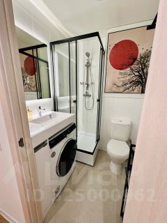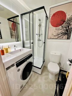 В санузле установленна современная стиральная машина в тумбе с умывальником и местом хранения бытовой химии. Зеркало большое с подсветкой, шкаф подвесной и современная душевая система.