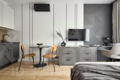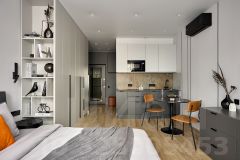 Техника: ТВ, холодильник, стиральная машина (с функцией сушки), посудомоечная машина, кондиционер, робот-пылесос, проточный водонагреватель, утюг, домофон.