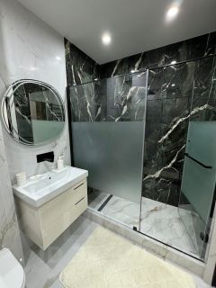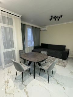 В квартире сделан качественный евроремонт. Комната и кухня обставлены необходимой мебелью, что позволяет сразу же заехать и жить без хлопот. На кухне установлен холодильник, а в комнате — кондиционер, поэтому вам будет комфортно в любое время года. В ванной комнате есть душевая кабина и стиральная машина.