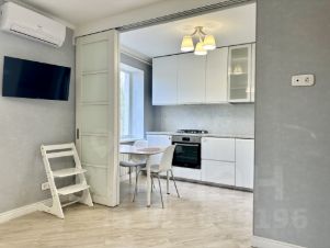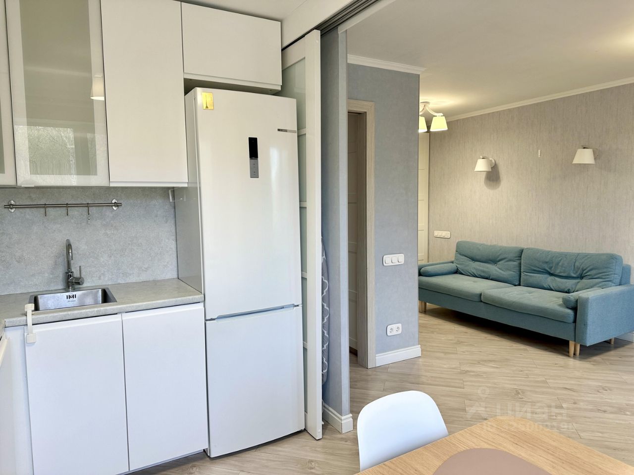 Комнаты СМЕЖНЫЕ. Уютная кухня со встроенной бытовой техникой, для удобства отделена от комнаты раздвижной дверью.