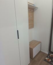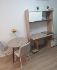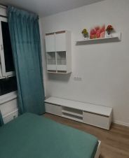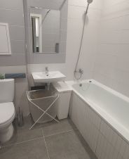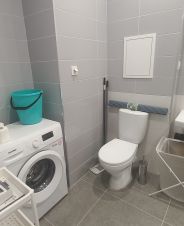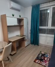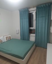 В квартире выполнен современный евроремонт. Комната и кухня полностью меблированы, здесь есть всё необходимое для комфортной жизни: кондиционер, холодильник, посудомоечная и стиральная машины. Окна выходят во двор, что обеспечивает тишину и уют. Совмещённый санузел оборудован ванной. Для вашего удобства в доме есть два пассажирских и один грузовой лифт, а также пандус.