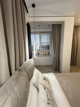 Внутри квартиры выполнен стильный дизайнерский ремонт. В наличии вся необходимая мебель как на кухне, так и в комнате. Из техники есть холодильник, посудомоечная машина, телевизоры и стирально-сушильная машина, кофемашина. Санузел совмещенный, он оборудован современной душевой кабиной. Вся техника и мебель новые и находятся в отличном состоянии. В спальне кровать 140см, удобный ортопедический матрас, премиальное постельное белье, шторы блэкаут. с 25.12 по 25.02, на 1 месяц цена 150.000₽