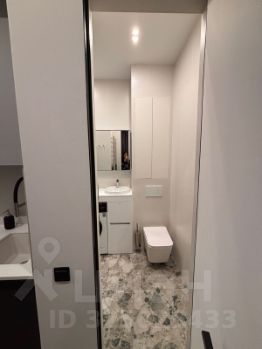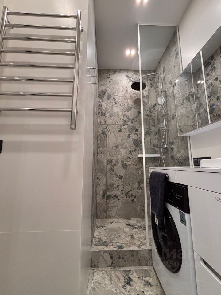 Санузел: душевая с остеклением в потолок — светлая, просторная. Стиралка, шкафы с хранением. Датчики протечки.