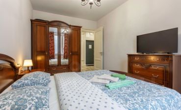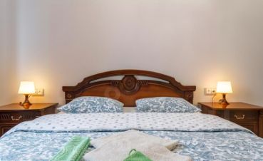 Удобства в апартаментах: Wi-Fi (200Мег/сек) - цифровое ТВ (130 каналов), качественные постельное белье и полотенца, детская кроватка (по запросу); две плазменные панели, СВЧ, чайник, вся необходимая посуда, стиральная машина- автомат, утюг, гладильная доска, фен и прочие бытовые мелочи.