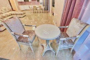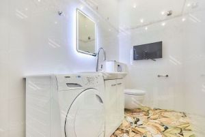 В квартире имеются три полных санузла и удобная прачечная, что предоставляет дополнительный комфорт и функциональность.