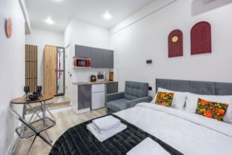 В апартаментах мы сможете отдохнуть и набраться сил на кровати с ортопедическим матрасом 140х200. Прекрасное сатиновое белое постельное белье позволит вам отлично выспаться.