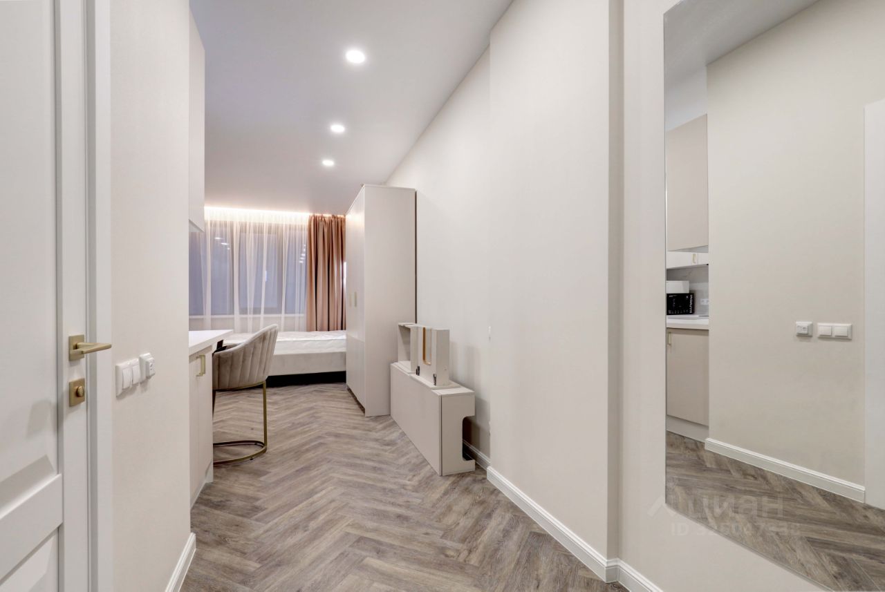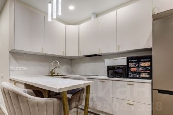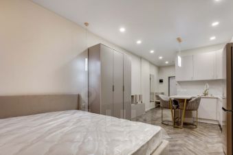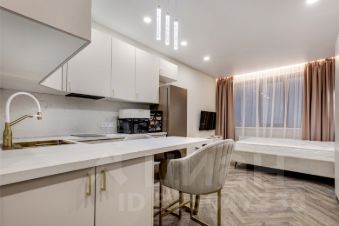 В ЖК Headliner предлагается квартира - студия с ремонтом в современном стиле. Планировка: зона кухни, спальня, ванная комната. Высота потолков составляет 3.1м. Из окон квартиры открывается вид на Москва-Сити.