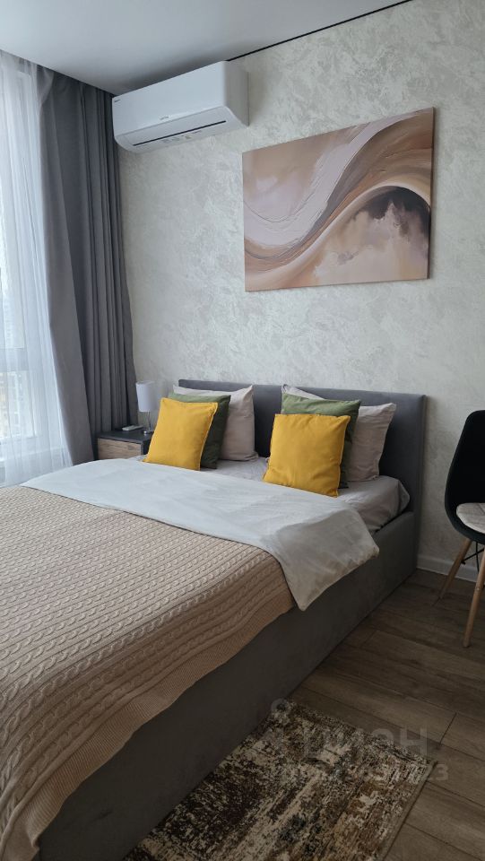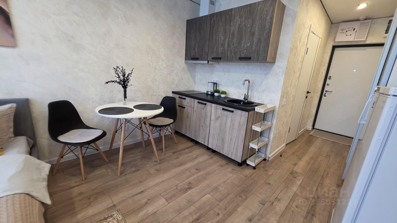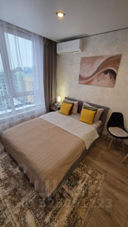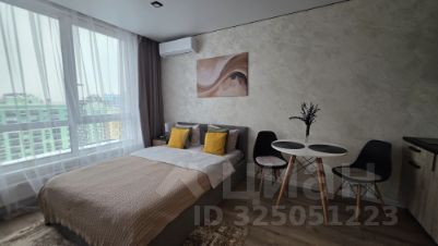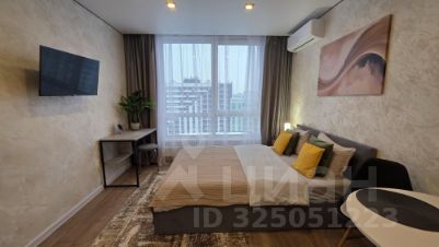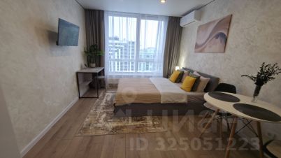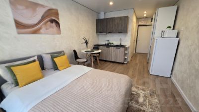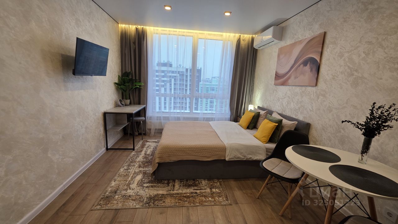 Уважаемые гости, приглашаем вас в стильную студию на 18 этаже современного дома. Просторная комната оборудована удобной двуспальной кроватью. При необходимости разместим дополнительную раскладную кровать с ортопедическим основанием, что позволит разместить до трех человек.