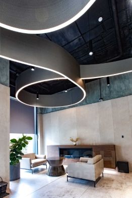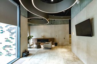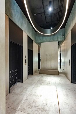 В ЖК расположено гранд-лобби проекта со стойкой ресепшн. В корпусе есть лаунж-зона с камином.