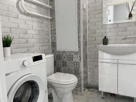В квартире есть всё необходимое для комфортного проживания: современная мебель на кухне и в комнате, а также полный комплект техники — кондиционер, холодильник, посудомоечная и стиральная машины, телевизор. В ванной комнате установлена ванна. Для удобства жильцов проведены интернет и телефонная связь.