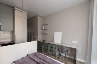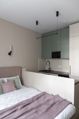 В студии есть кухня с барной стойкой, удобная кровать шириной 140см, а также вместительные шкафы в комнате, на балконе и в сан.узле. Санузел совмещенный, выполнен в светлых тонах, установлен гигиенический душ.