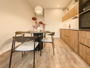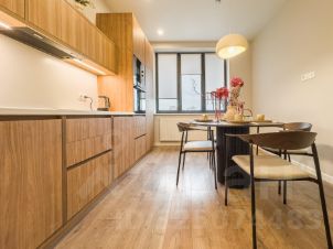 • полностью укомплектованная кухня: индукционная плита, вытяжка, встроенный холодильник, микроволновая печь, духовой шкаф, посудомоечная машина, стиральная машина, чайник.