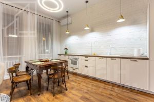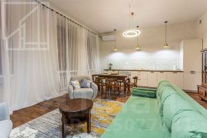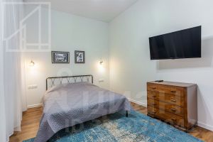 Планировка включает две большие спальни, просторную кухню-гостиную, отдельную постирочную-гардеробную, большой санузел. Потолки 3.5м. Квартира полностью меблирована и оснащена всей необходимой техникой.
