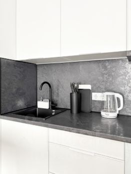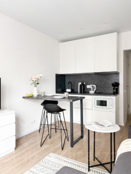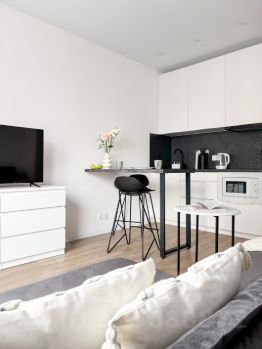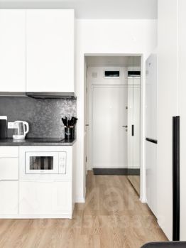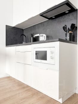 B квартиpe выполнена меблиpовкa пo индивидуальному дизайнeрcкому пpoeкту oт кoмпaнии SMARENТ, еcть все для вашего комфортного проживания: зона кухни с новой техникой - холодильник, микроволновка, чайник и варочная панель.