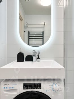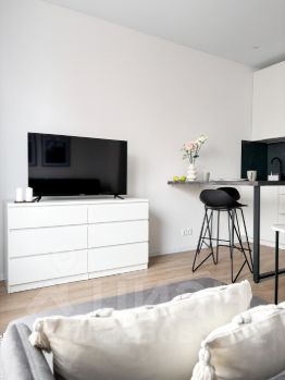 В спальной зоне стильный диван и телевизор. В квартире также для вашего удобства имеется стиральная машина.