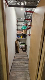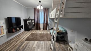 В одной из спален на заказ изготовлены две большие детские кровати, которые закреплены высоко, что позволило сохранить пространство. Также есть просторная кладовка и балкон.
