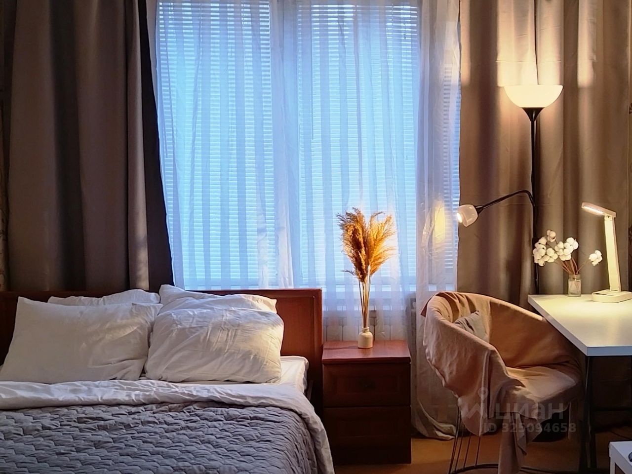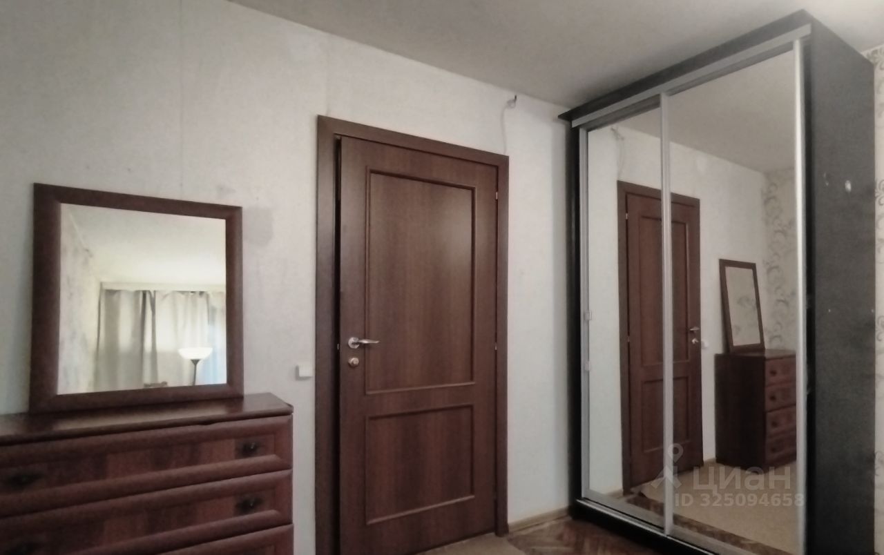 В самой комнате - большой зеркальный шкаф-купе, большая 2х спальная кровать (ширина спального места - 1,4м) с ортопедическим матрасом, комод, кресло, столы Икеа. Проведен интернет.