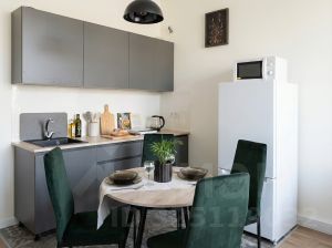 кухня полностью оборудованная для приготовления еды и сервировки
