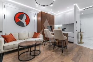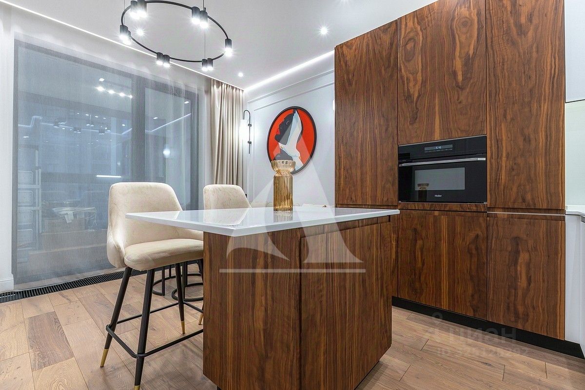 Вся мебель выполнена по индивидуальному заказу от ведущих производителей. Кухня со всей бытовой техникой (Bosch, Haier). Сантехника (Италия, Германия-Boheme,Villeroy&Boch). Пол инженерная доска (Швеция) и керамогранит c теплым полом.
