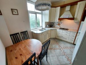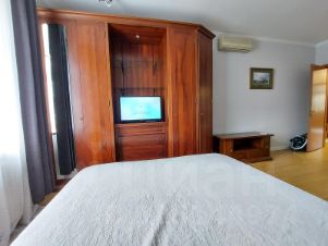 Квартира на две стороны дома - окна выходят во двор и на бульвар (летом прохладно). Застекленный балкон. Высота потолков 3м. Пол - паркет и плитка. В детской комнате площадью 12 м.кв.- 2-х ярусная кровать (есть детский диван), детская стенка, столик и 2 стульчика, открытые книжные полки. В спальне площадью 20 м.кв.- кондиционер, 2х сп. кровать 180 x 200, 2 прикроватные тумбы, стенка, угловой сервант, тумба под TV. Кухня 10 м.кв. - встроенный кухонный гарнитур, маленькая посудомоечная машина, газ. плита, вытяжка, отдельная эл. духовка, 2-х камерный холодильник, стол и стулья. С/У раздельный. В ванной стиральная машина. В туалете раковина и водонагреватель пр-ва Германия. Прихожая сделана на заказ, в неё входит 2 шкафа, антресоль, вешалка для одежды и шкафчик для обуви. Есть пылесос и глад. доска.