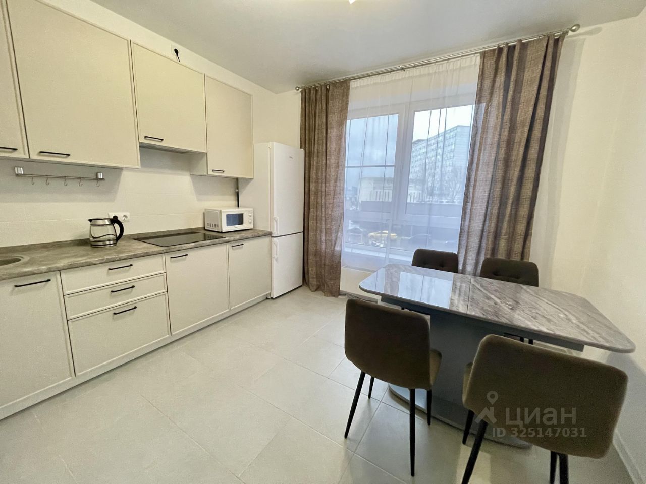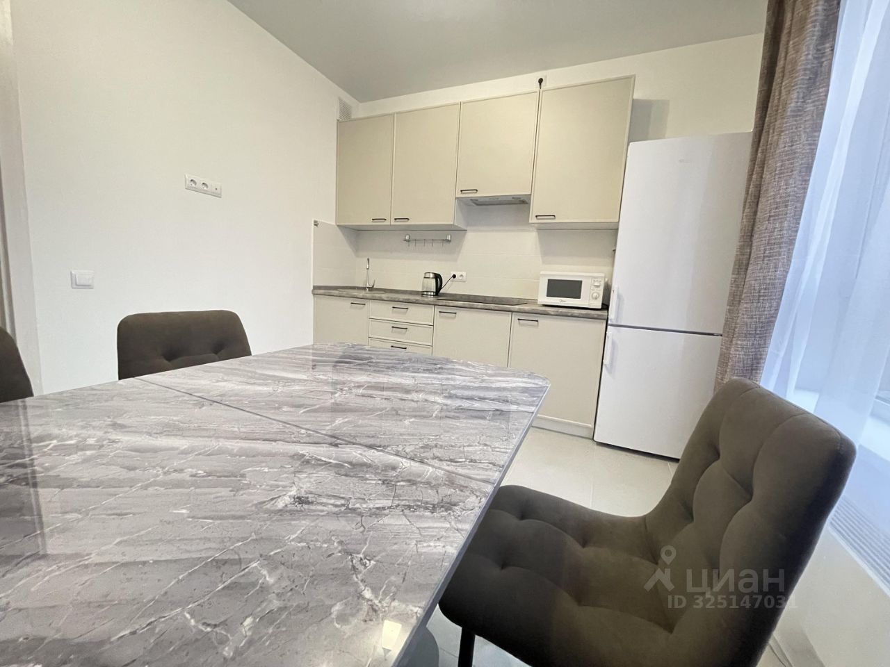 Кухня встроенная с наличием всей бытовой техники от ведущих производителей.