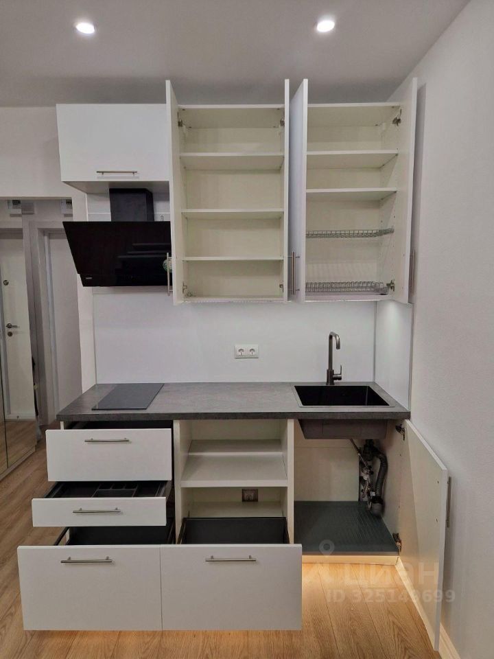 - белая матовая кухня с глубокими ящиками, оборудована подсветкой,