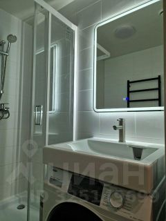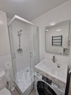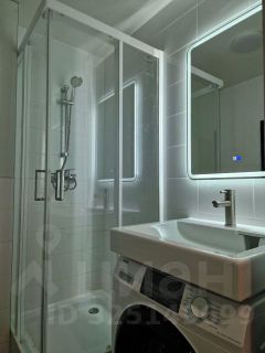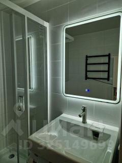 душевая кабина со стеклянными створками, навесная раковина, большое сенсорное зеркало с подсветкой, шкаф-пенал, качественная стиральная машина, эл.полотенцесушитель, коврики.