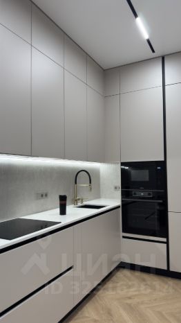 Просторная кухня-гостиная укомплектована кухней до потолка со столешницей из кварца, оснащена встроенной техникой Gorenje: холодильник, духовой шкаф, микроволновая печь, посудомоечная машина, индукционная 4-х конфорочная варочная панель, вытяжка, мойка Omoikiri, диспенсер.