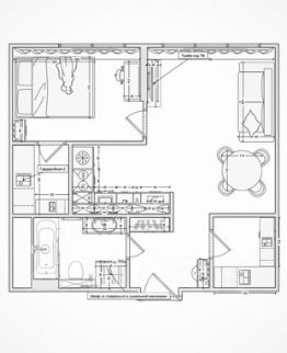 В зоне гостиной располагается большой диван, стол из массива карагача, мягкие стулья из ясеня, тумба под ТВ. В спальне кровать 200*160 с ортопедическим матрасом. Встроенный шкаф в коридоре для верхней одежды.