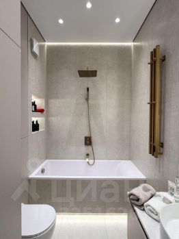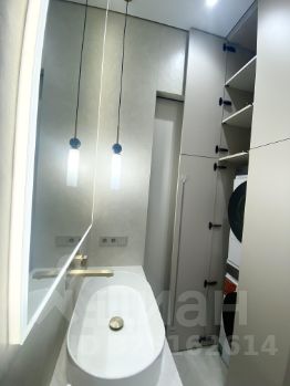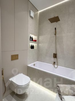 Ванна из литьевого мрамора, тропический душ, подвесной унитаз с инсталляцией, гигиенический душ, подвесная тумба с раковиной, встроенный шкаф со стиральной и сушильной машинами.