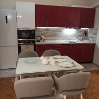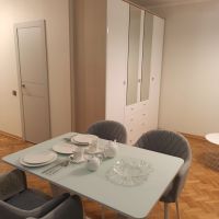 Однокомнатная квартира (еврооднушка) 47 м2, с двумя изолированными спальными зонами (спальное место размером 160*210), новой мебелью; кухня-столовая оборудована всем необходимым: столовая группа с четырьмя полукреслами, стеклокерамическая плита, встроенная печь СВЧ, встроенный духовой шкаф, большой современный холодильник; гардеробная, прихожая, с/у совмещённый площадью 4,3 м2: ванна (литой мрамор), тумба с раковиной (литой мрамор) с крылом над стиральной машиной, смесители GROHE, большое зеркало с подсветкой, накопительный водонагреватель (50 л), стильный электрический полотенцесушитель, новые аксессуары BEMETA, автоматическая система защиты от протечек NEPTUN. Имеется линия Интернет (1000 Мб/сек).
