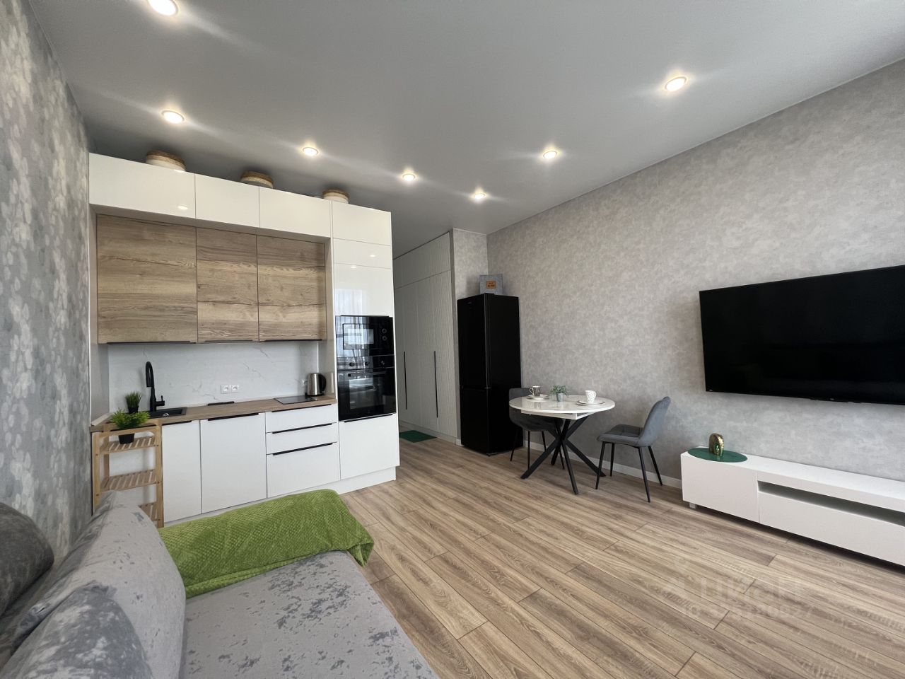 Интерьер студии выполнен с учётом современных тенденций. В кухне и жилой зоне есть вся необходимая мебель. В распоряжении арендаторов — кондиционер, холодильник, телевизор, посудомоечная и стиральная машины. Уютная и функциональная обстановка позволяет максимально эффективно использовать пространство.