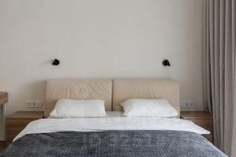 Светлая, уютная квартира с панорамными окнами и дизайнерской отделкой. Пространство зонировано: спальня, кухня, рабочая зона. Спокойные оттенки, натуральные материалы и мягкое освещение создают атмосферу уюта и комфорта.