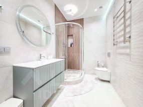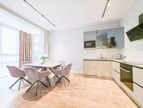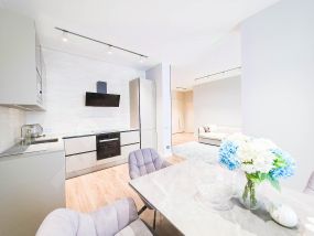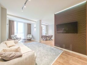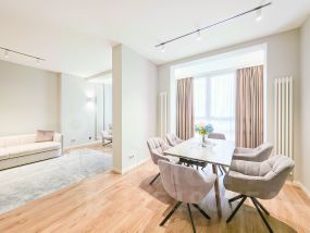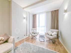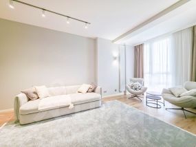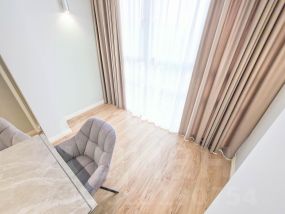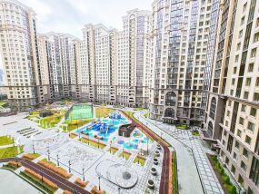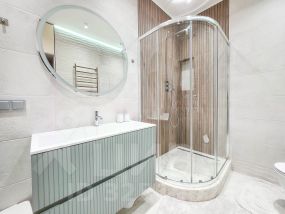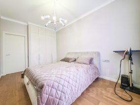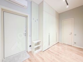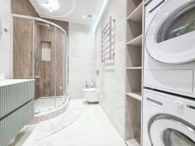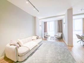 В квартире современный, новый ремонт в теплых постельных тонах с использованием качественных отделочных материалов. Повсеместно плитка с функцией подогрева, фактурный ламинат. Есть все необходимое для проживания мебель, техника, от известных проверенных брендов, качественная немецкая сантехника. Высокие потолки, керамические батареи отопления, кондиционер, стиральная и сушильная машина от компании. В квартире один сан узел, гардеробная. Все в отличном состоянии, новое. Показы и заселение оперативные.