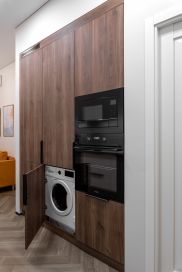 - бытовая техника (вся встроенная): варочная панель, вытяжка, духовой шкаф, микроволновая печь, посудомоечная машина, холодильник, стиральная машина,