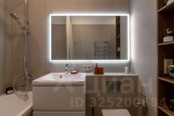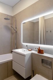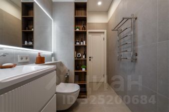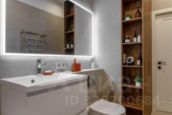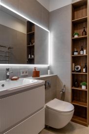 Полностью оборудованный САНУЗЕЛ (ванна, унитаз, гигиенический душ, раковина с навесным шкафом, большое зеркало с подсветкой, шкаф от пола до потолка с открытыми полками, полотенцесушитель).