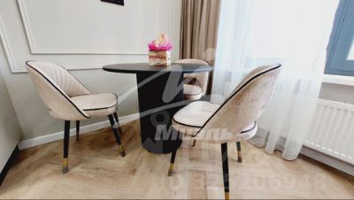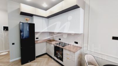 - Светлая кухня-гостиная со встроенной кухней и бытовой техникой (варочная панель, духовой шкаф, посудомоечная машина, холодильник). Отдельная зона с диваном и обеденным столом с 3 креслами.