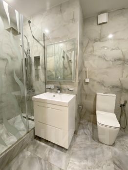 Кухня со встроенной техникой, есть микроволновая печь. Кондиционер. Всё, как на фото. Возможна покупка посудомоечной машины. Санузел в плитке.